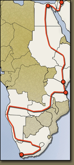Päästyämme Kongon alapuolelle otamme suunnan länteen, kohti eteläisen Afrikan sydämessä sijaitsevia viktorianputouksia ja maailman kauneimmaksi valtioksi kehuttua Namibiaa. Namibiasta käännämme kurssin jälleen etelään, kohden pääränpäätämme Kapkaupunkia.