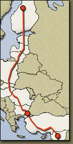 Euroopan halki reitti kulkee Eu:n itäistä rajaa. Alkumatka taittuu urakkaluontoisella ajamisella. Mielenkiintoisia kohteita tarjonnee eteläisen euroopan Romania, Bulgaria ja Turkki.